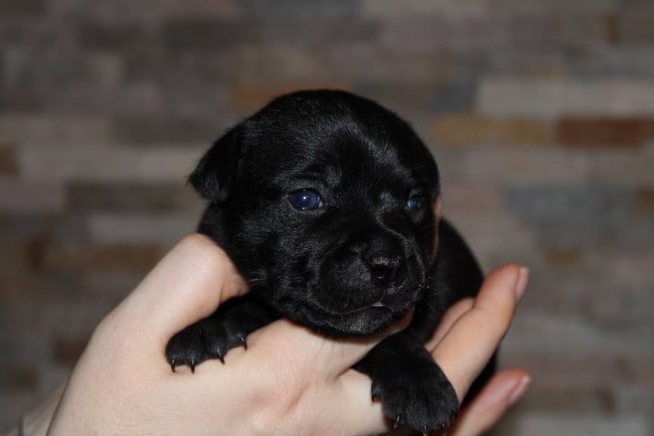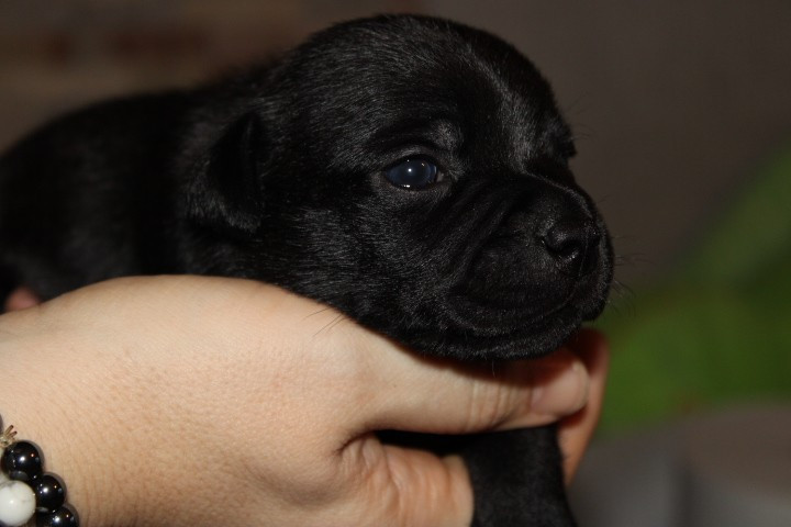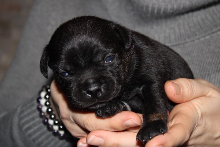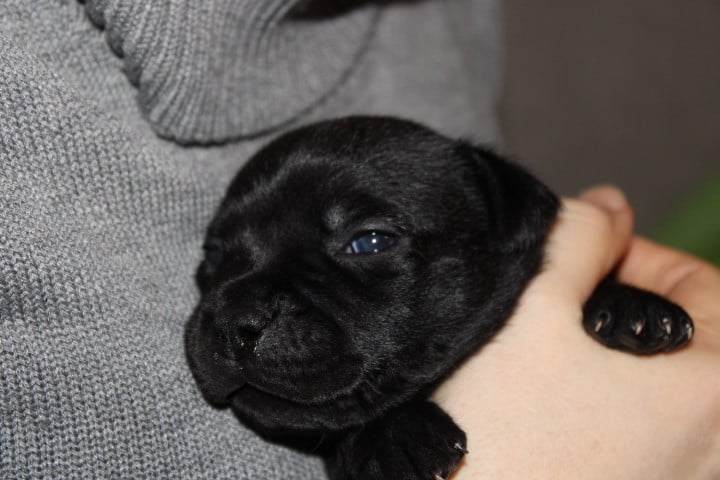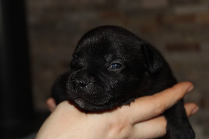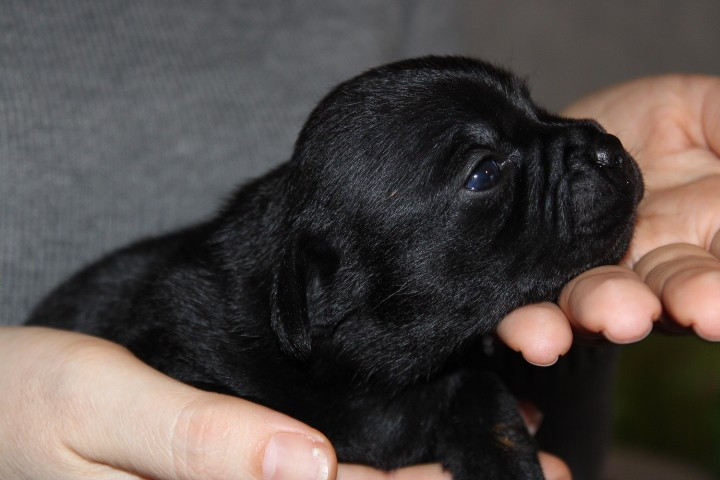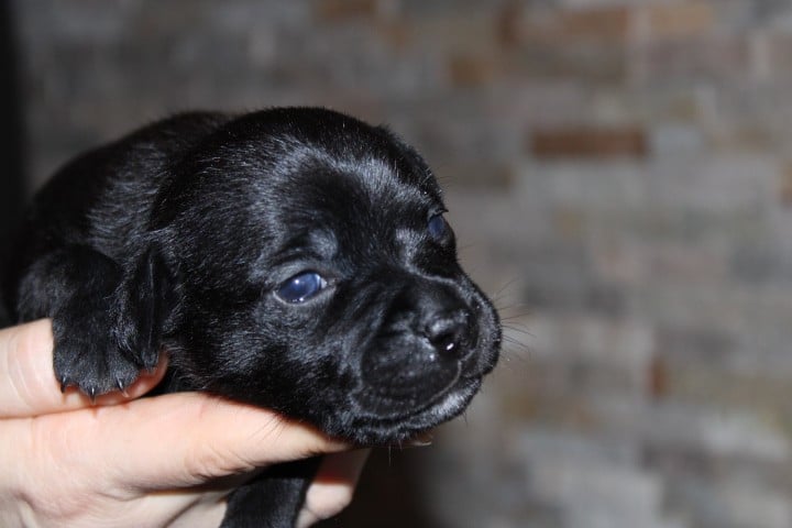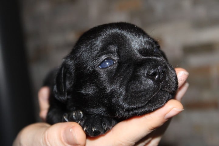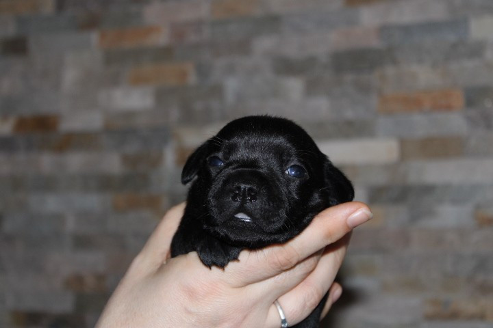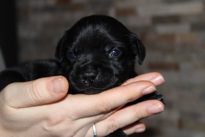 25/01/26 - Les bébés ont à peine 2 semaines. Ils ont ouvert leurs yeux. Ils sont noirs mais au soleil, certains montrent des reflets marrons qui pourraient laisser penser qu'ils seront bringés foncés comme papa.