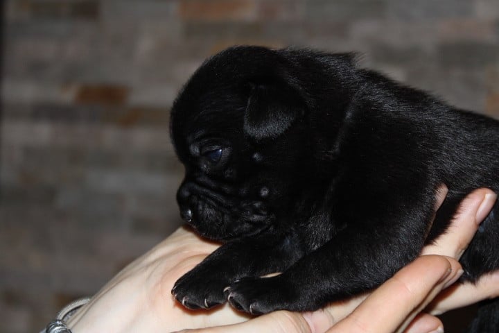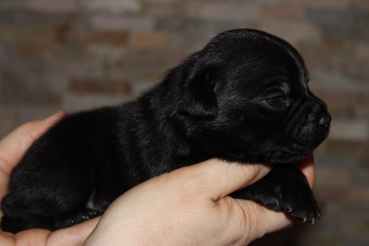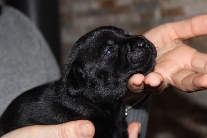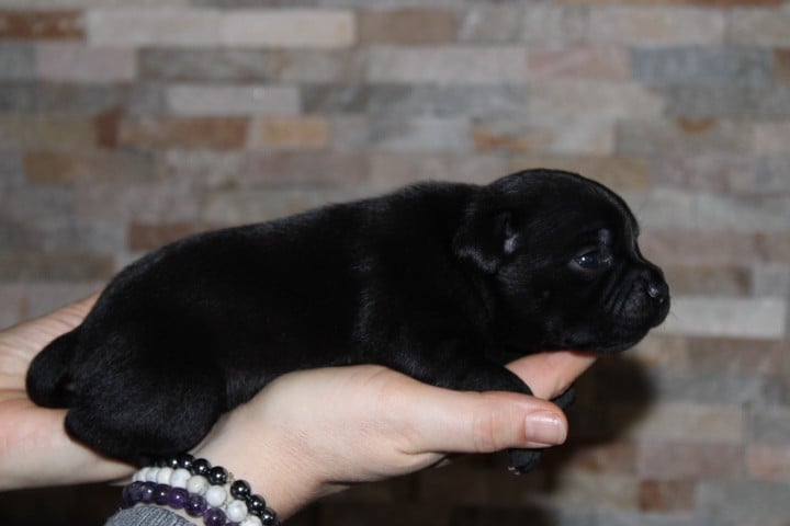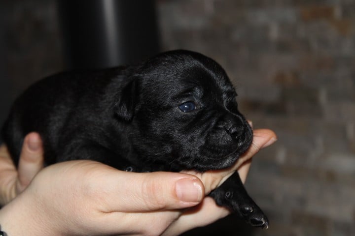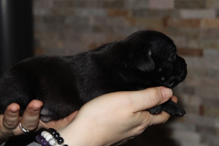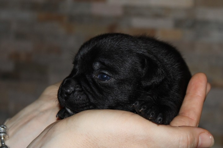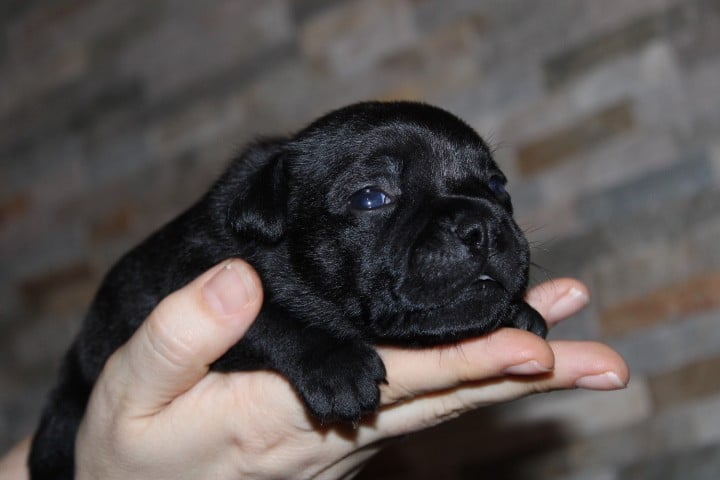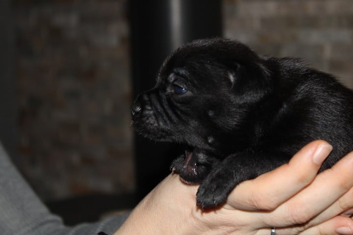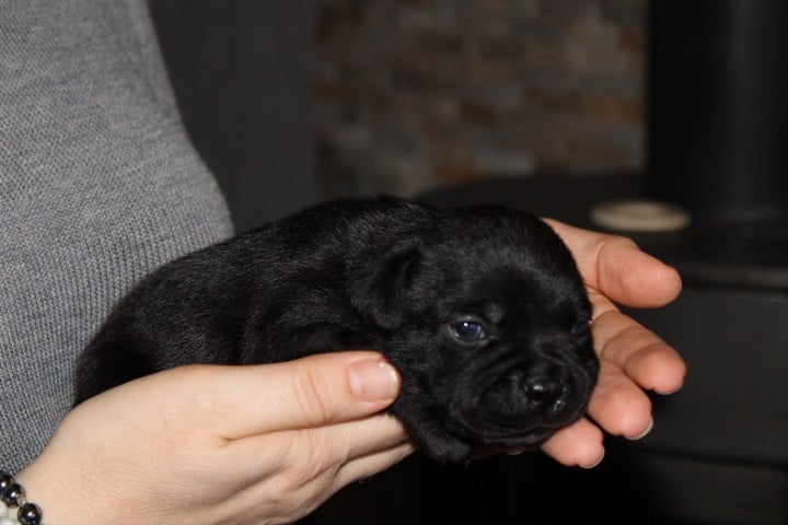 25/01/26 - Les bébés ont à peine 2 semaines. Ils ont ouvert leurs yeux. Ils sont noirs mais au soleil, certains montrent des reflets marrons qui pourraient laisser penser qu'ils seront bringés foncés comme papa.